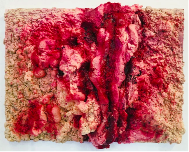 Polyurethane foam, concrete mix, dye, nitrile gloves, spay paint, and resin on wood panel